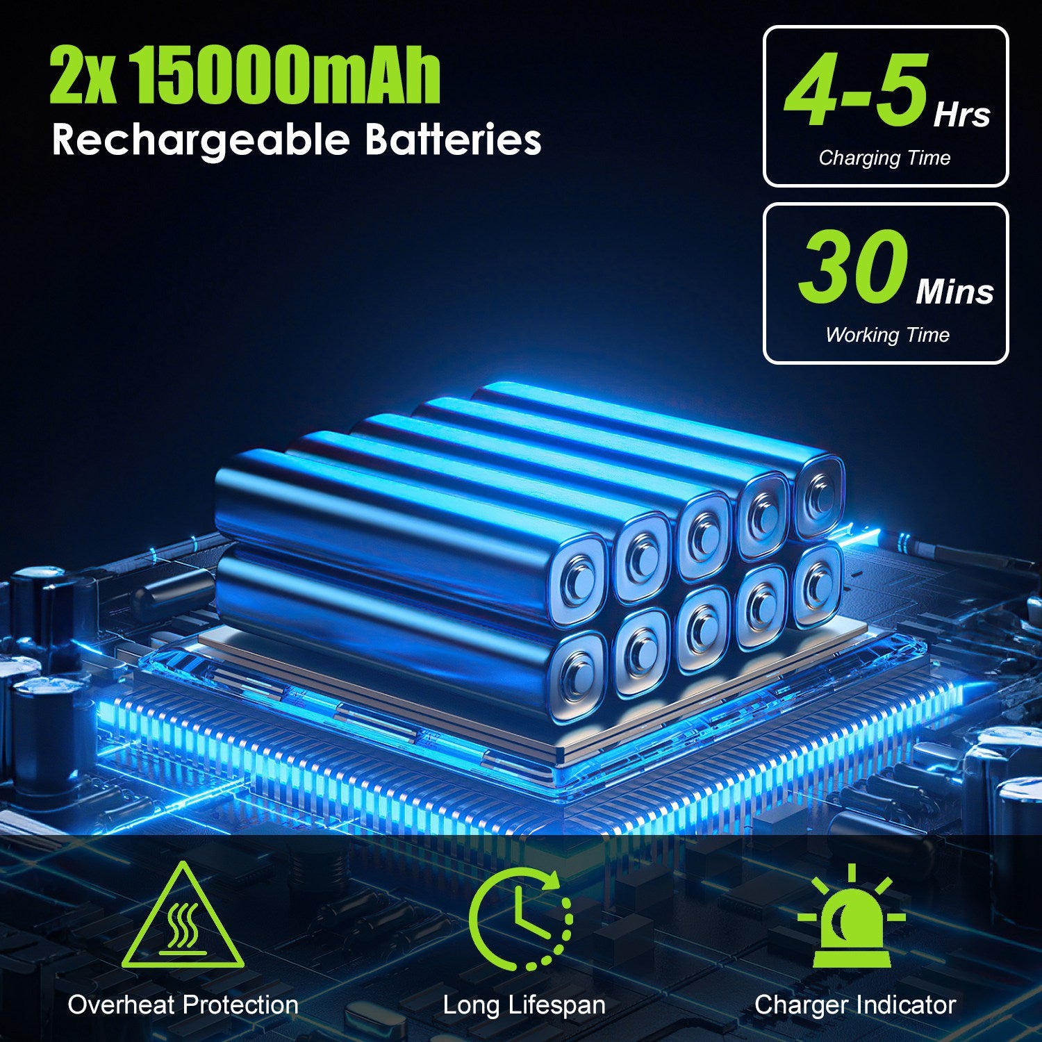 - 2 rechargeable 15,000mAh batteries (double the runtime!)